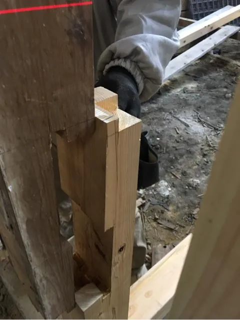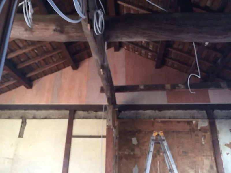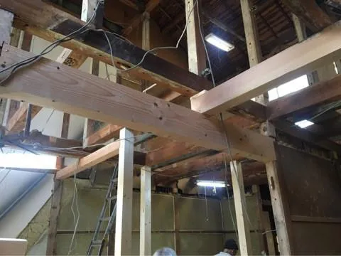 柱を撤去する際の注意点として、柱がなくなってもそれを支えている梁の大きさが適切かどうかです。余力のある構造の場合、柱を撤去しても大丈夫な場合もありますが、通常は梁を補強する必要が出てきます。下の写真のように、濃い木の部分(古い梁)の下にある白木が補強梁です。