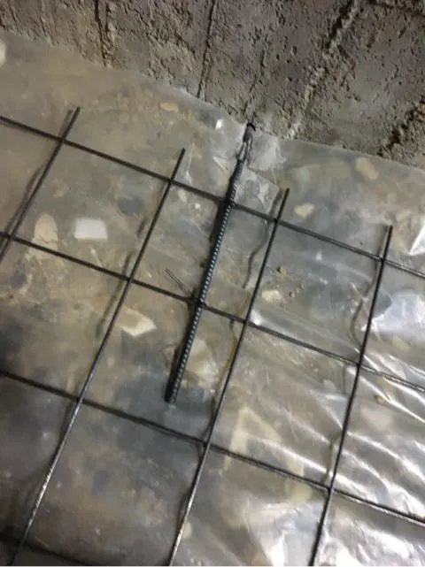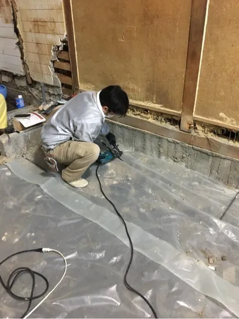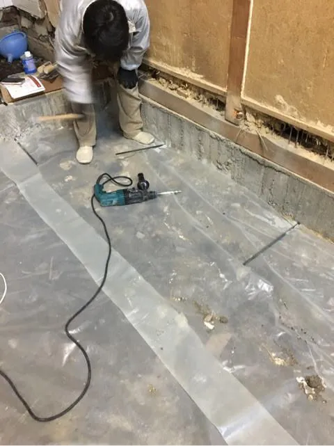 まずは床下に防湿シートを敷き詰め、既存の布基礎にした穴を置けてアンカーを打ち込みます。