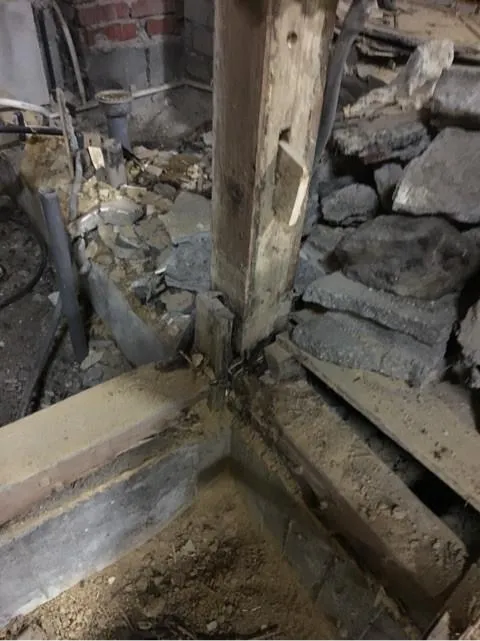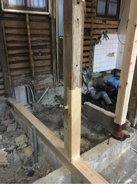 特に水廻り付近の土台や柱は湿気をよく吸うため、高い確率で腐っており、構造体としての機能をなくしています。